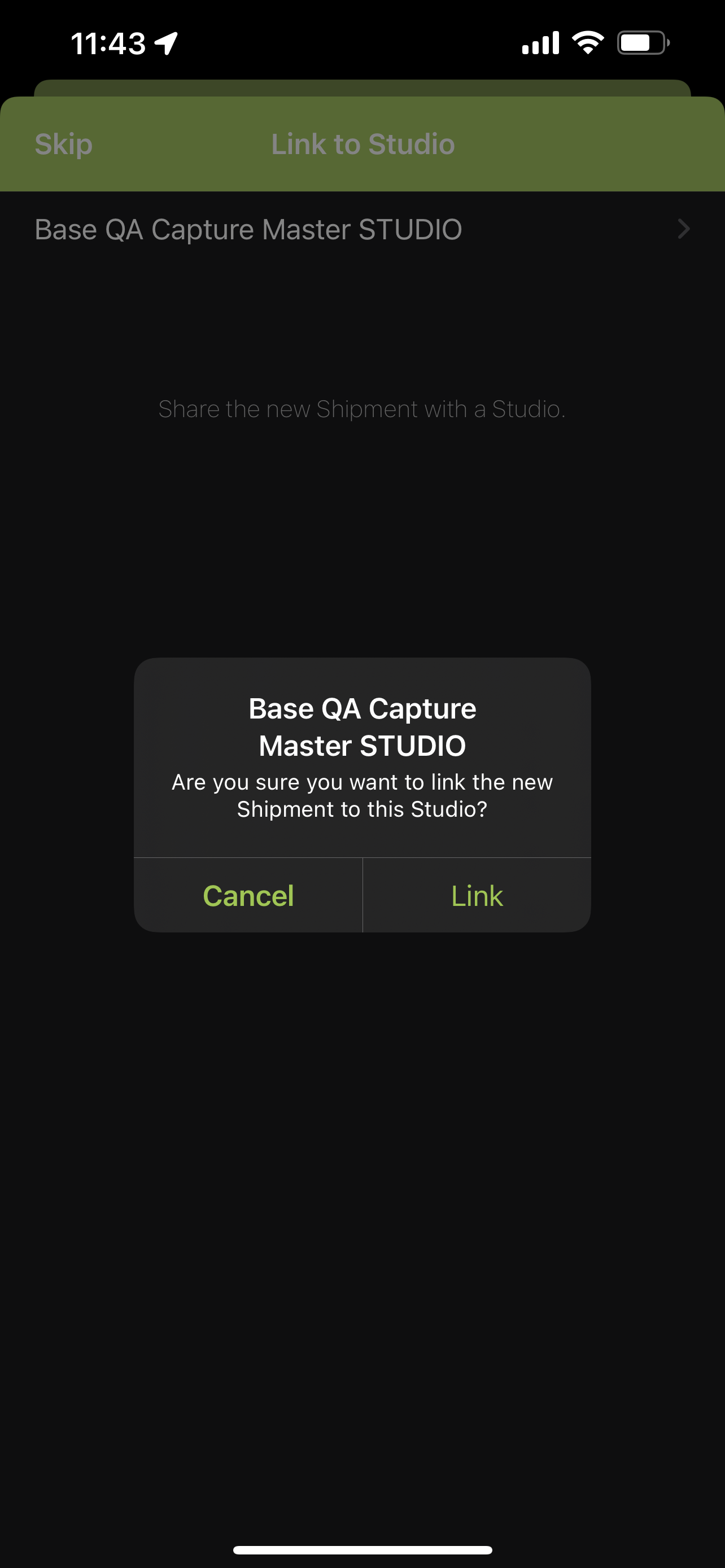 4. If a Studio is chosen, a popup will appear asking for confirmation to link the newly created Shipment to the selected Studio. Choosing Cancel will not link the Shipment to the Studio. Choosing Link will link the Shipment to the Studio.