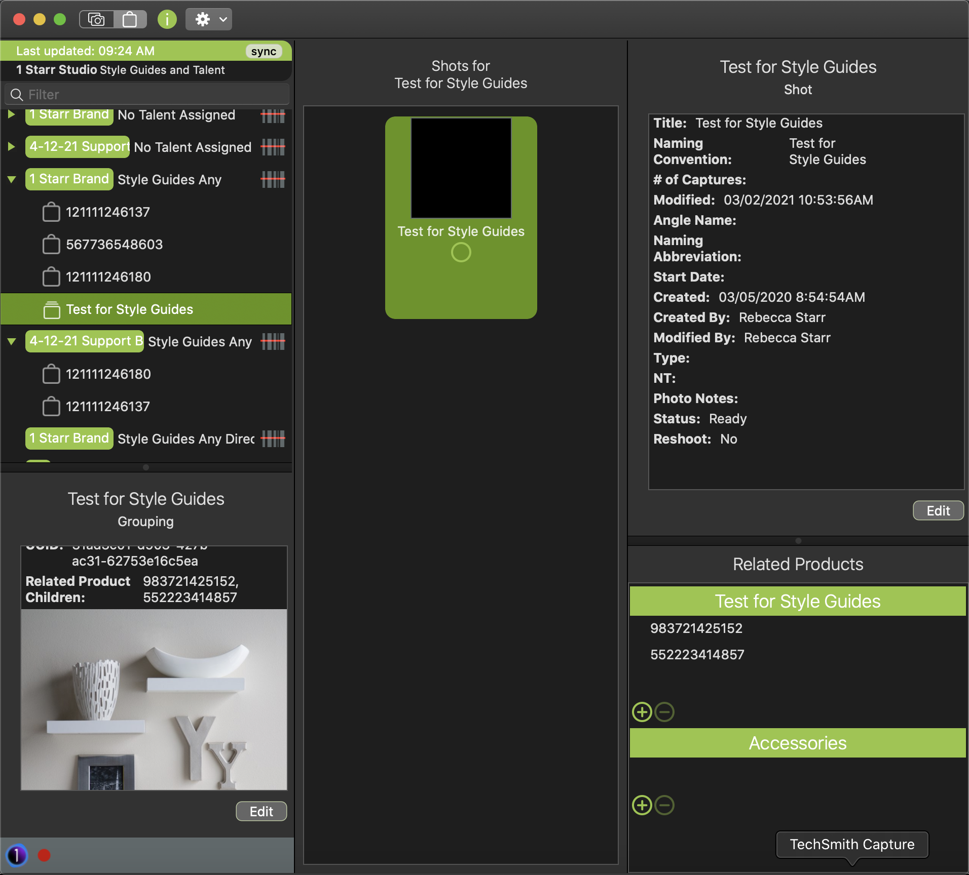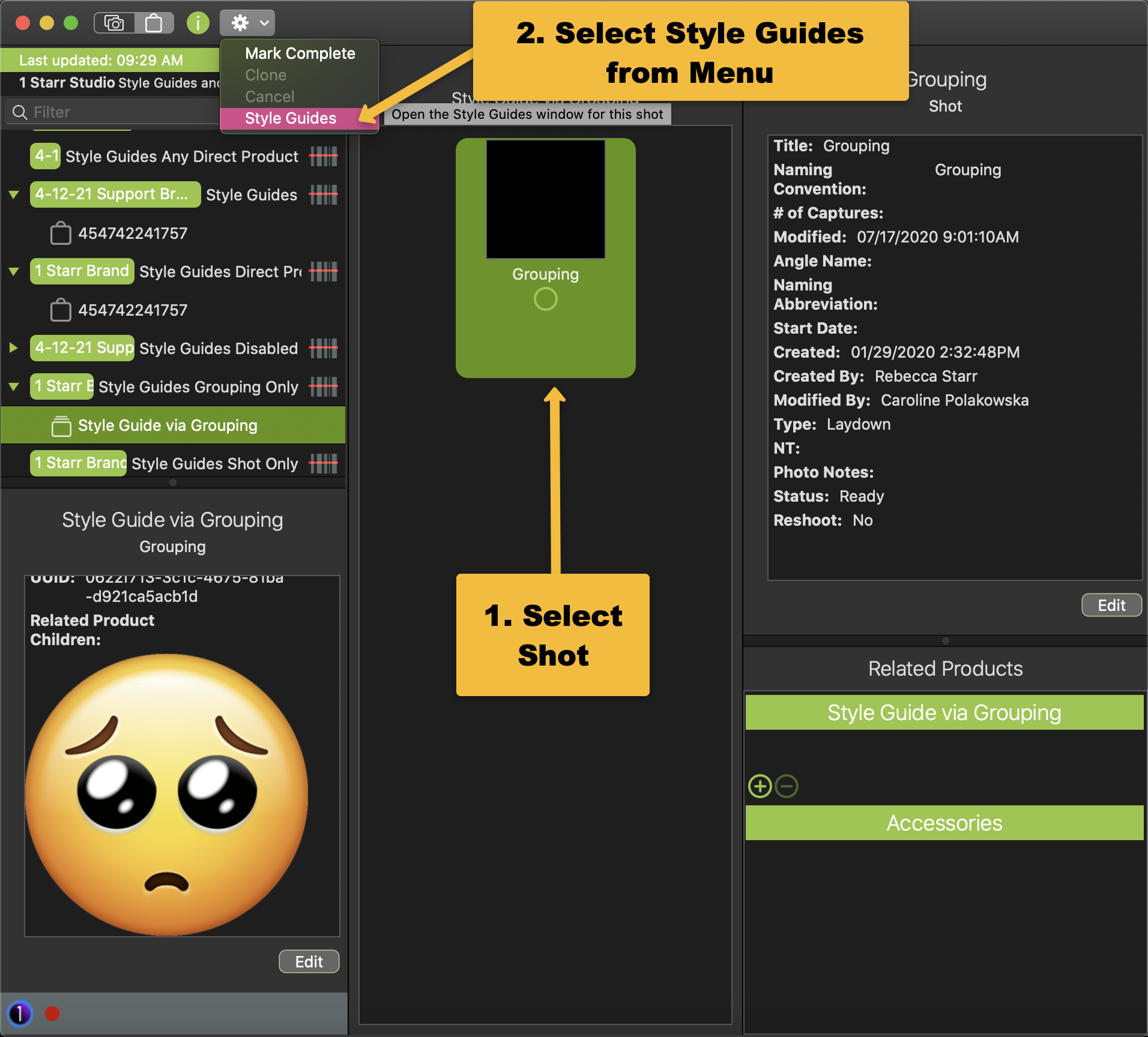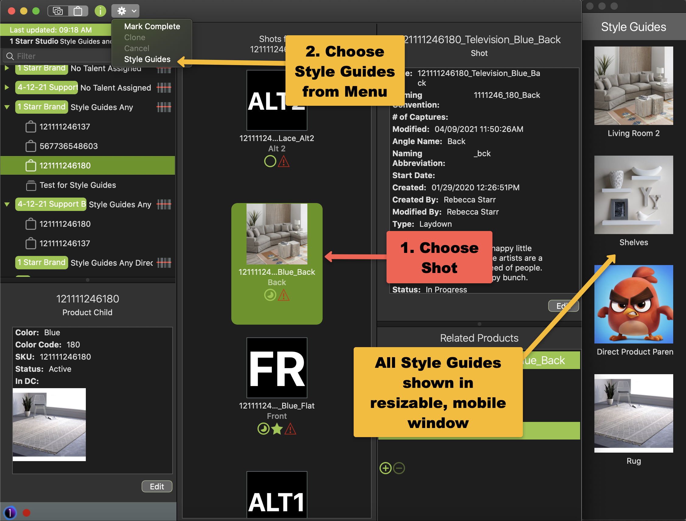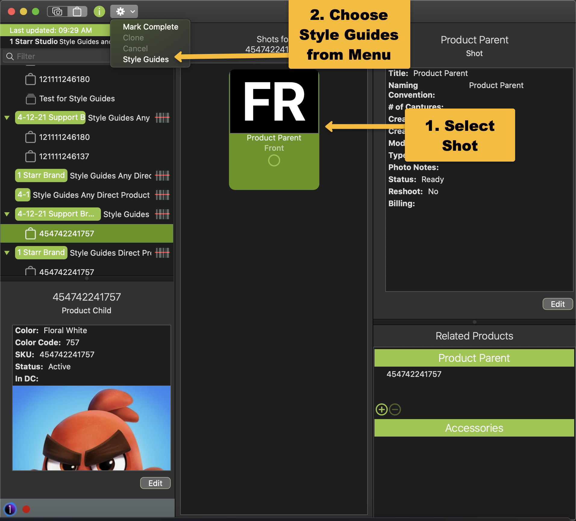 Style Guides related to Product Parents will show in one of two ways: First, by selecting the shot, then referencing the Product Detail Section of the List Panel. Second, by selecting the shot, then choosing the Action for a Shot menu and select Style Guides.