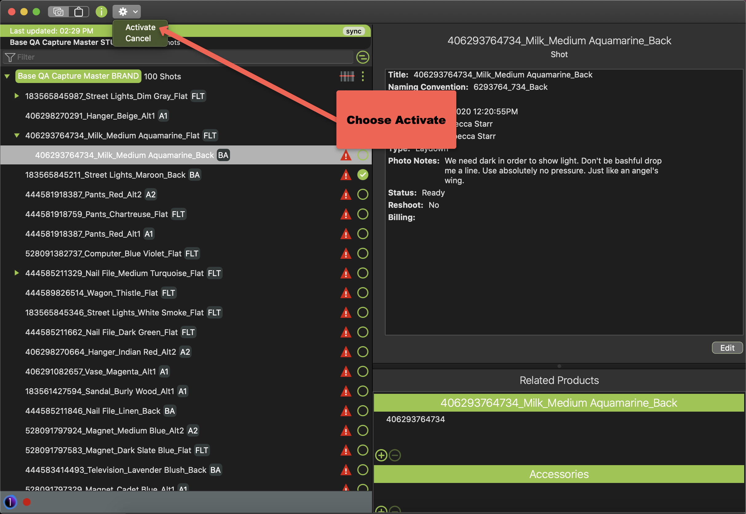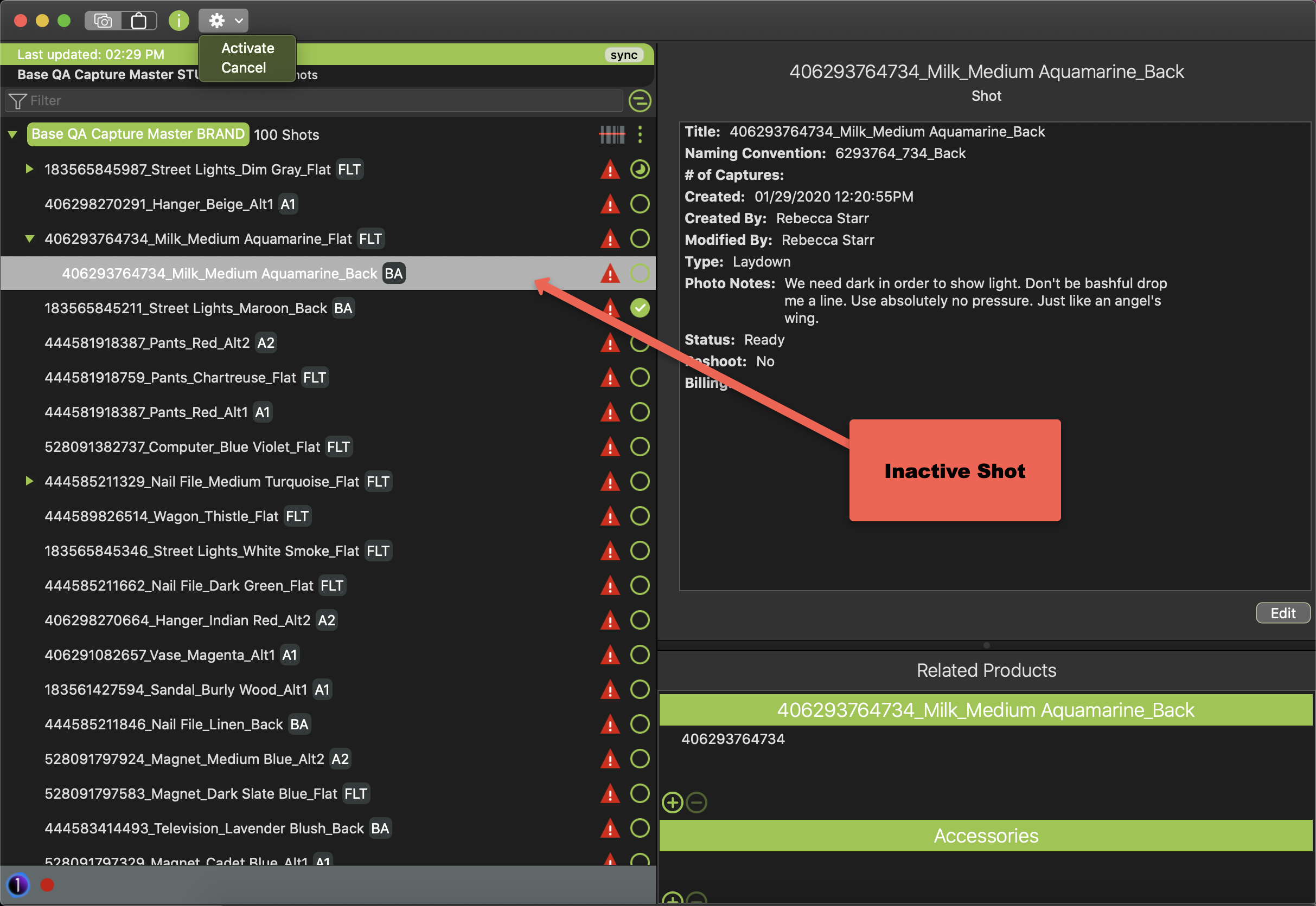 To activate an optional Shot that you intend to fulfill on-Set, select the inactive Shot, then select the {gear} icon on the control strip, and select “Activate” from the {gear} menu. This shot’s highlight color will change from gray to green and it will now be active for all ShotFlow capture functionality, including cancelling and cloning (if enabled for Shot List). The “Added on Set” flag will also be set to TRUE/YES for this Shot, enabling reporting on which optional Shots were enabled on-Set.