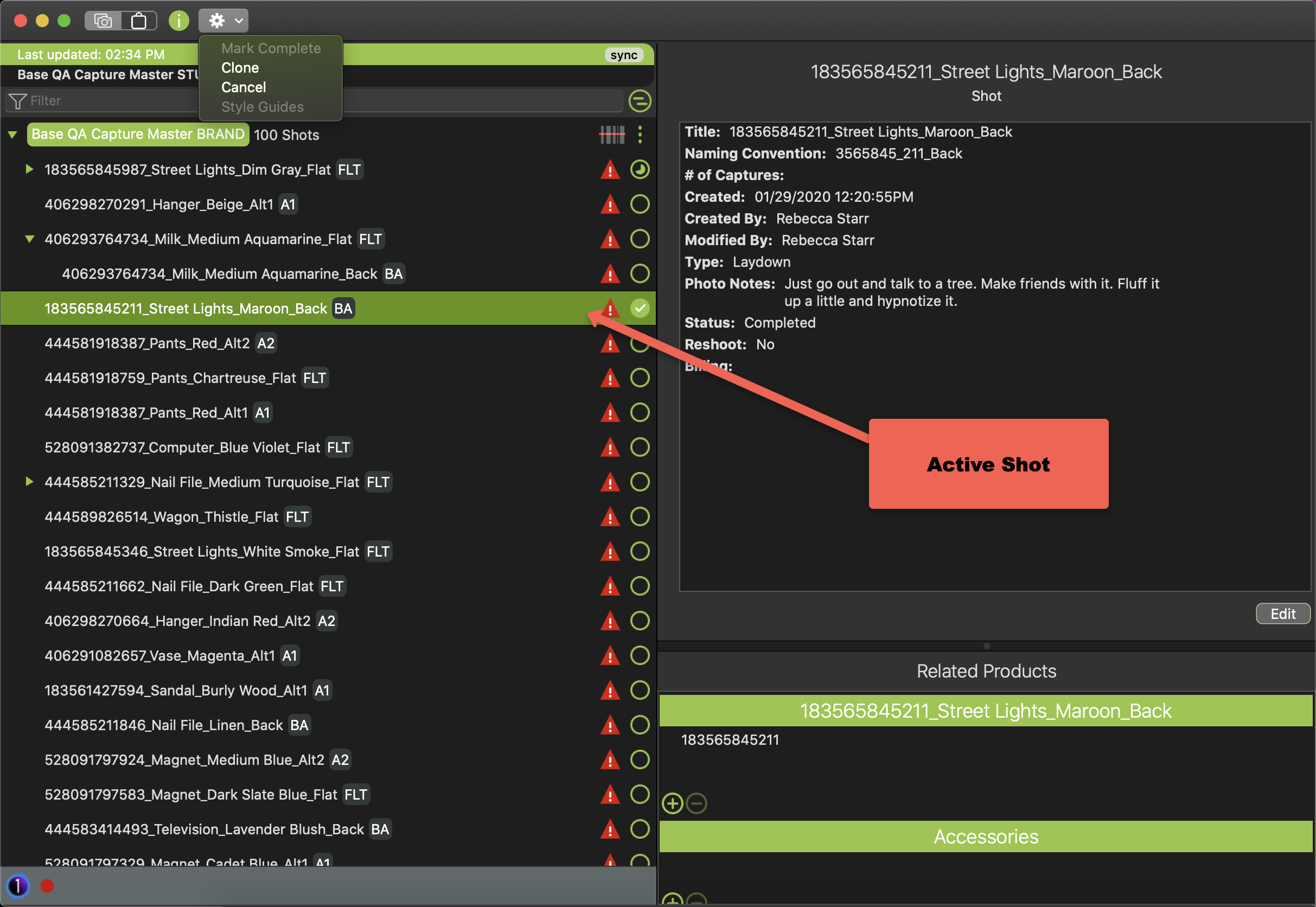 - The menu displayed from a contextual menu activation anywhere within the frame will display the following options: Mark Complete, Mark Cancelled, Clone (which will be inactive if the Shot List does not enable it), Show Details
