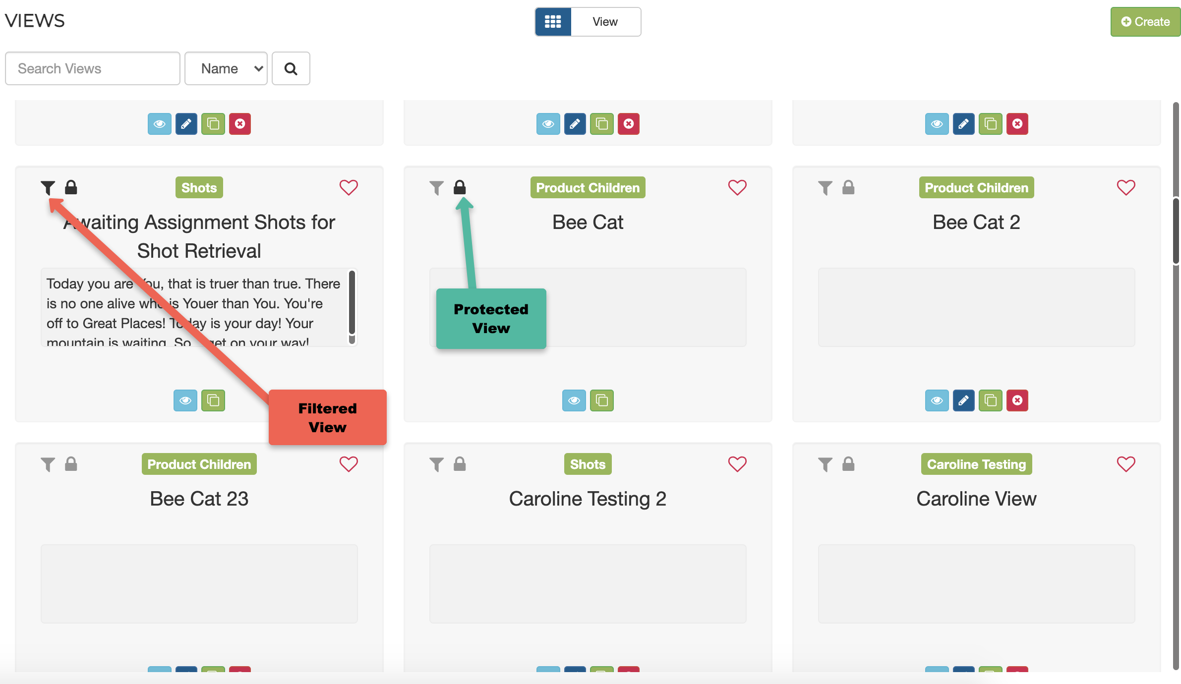 When a View is Filtered or Protected, the icons are darkened in the Card View and checked in the List view.