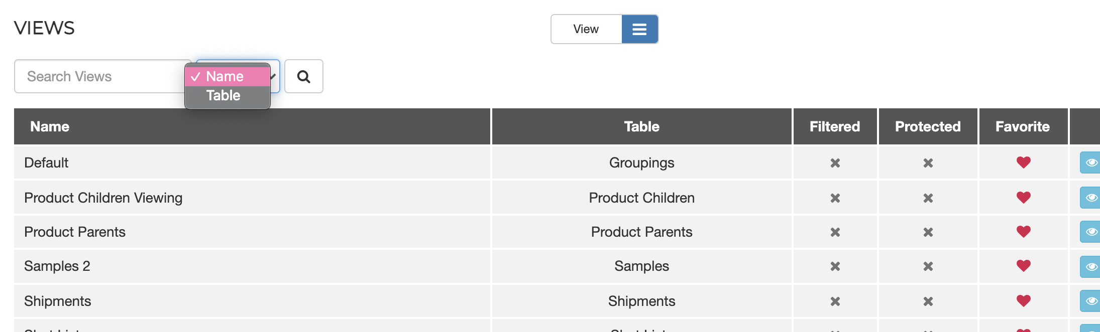 You can choose to search for a View by Name or by the Table it originates on. Enter at least 3 characters in the [Search Views] box and then choose Name (default selection) or choose Table and then choose the Table from the dropdown menu.