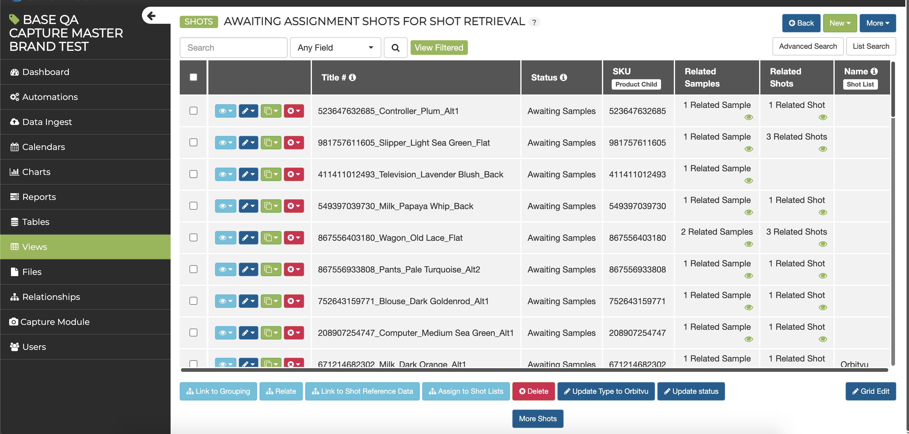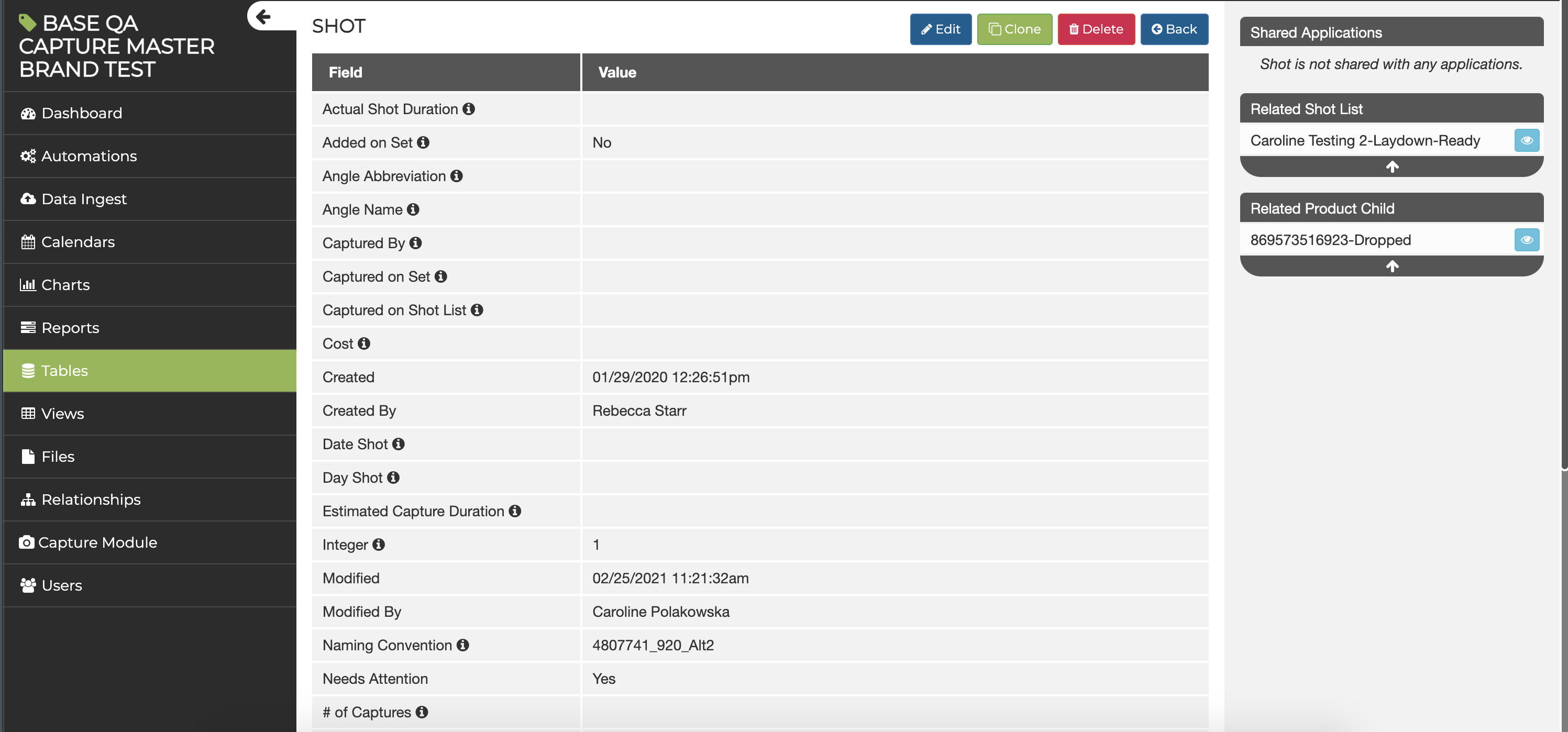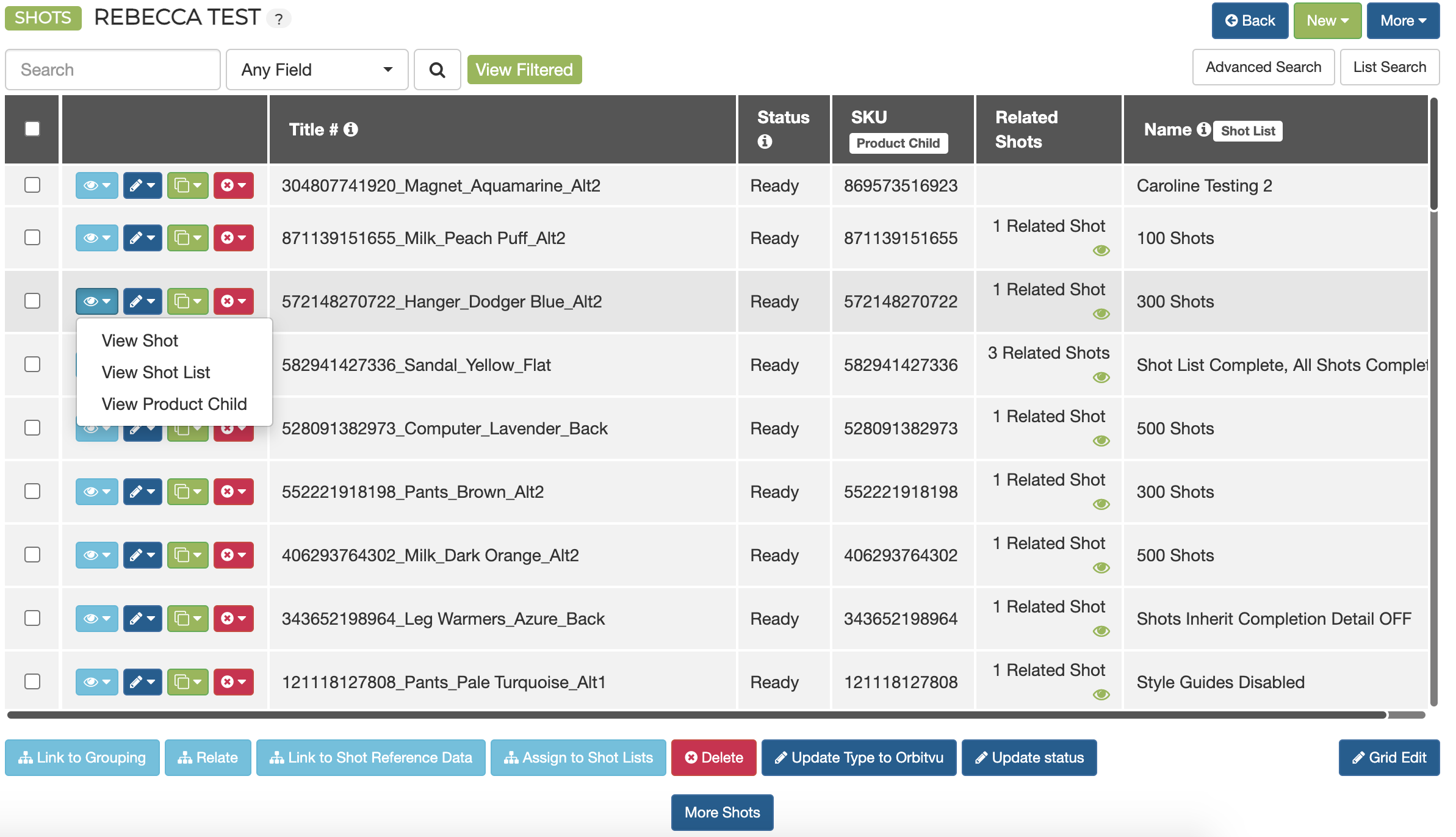 In this example, the View enables you to View, Edit, Clone or Delete Shot, Shot List or Product Children records.