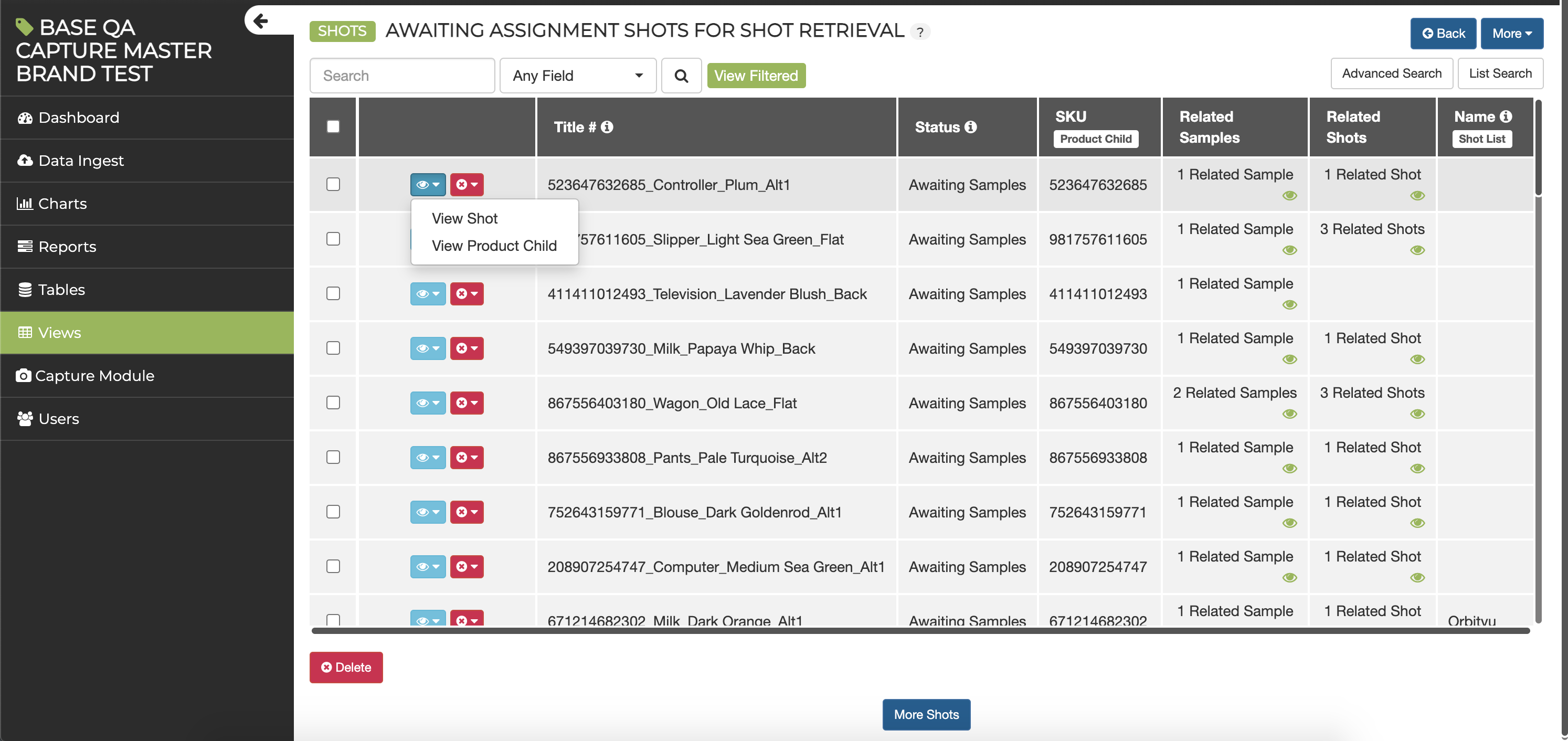 For example, this View enables you to take action on the Shot records and/or the Product Child record related to the Shot. For this user's Role, the action options are to View or Delete records.