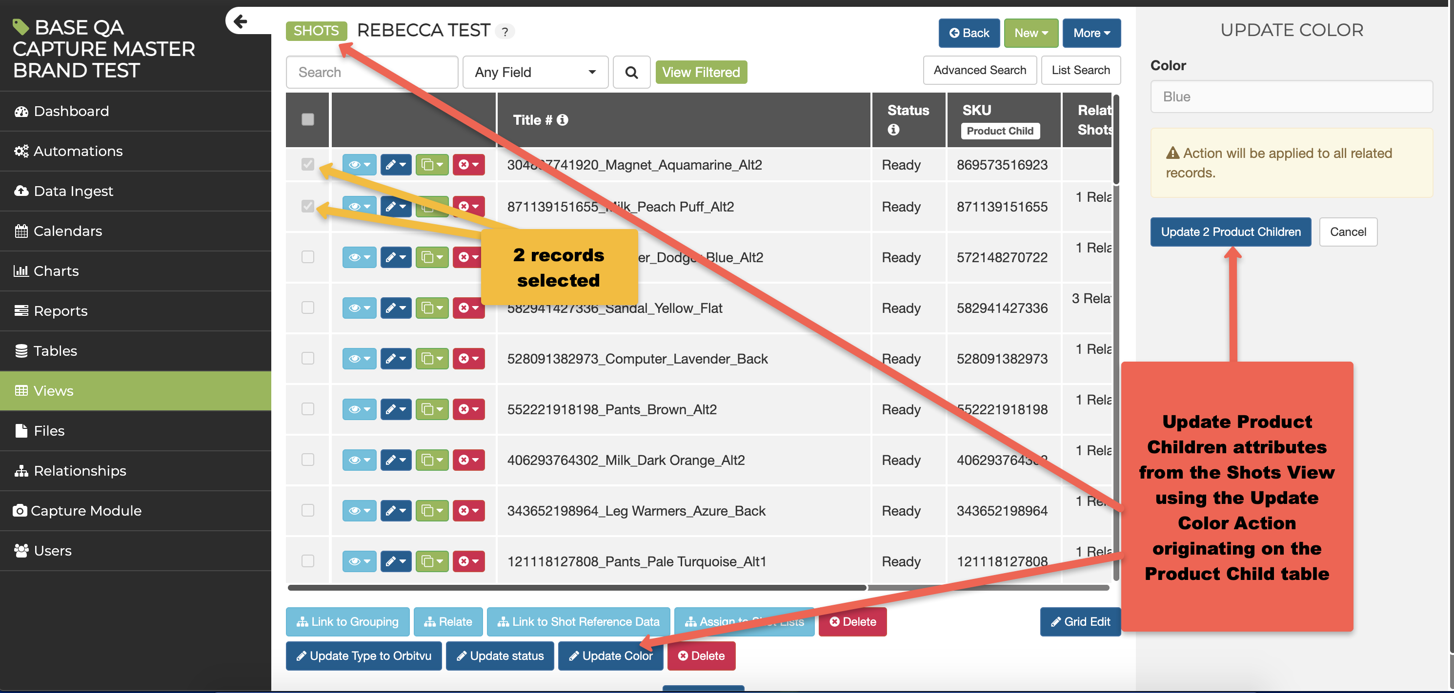 A View can include Actions from multiple Tables. If the chosen action originates on another table, the action taken against the selected records will apply to the related records. In the example below, two Shot records are selected, but the [Update Color] action chosen (which originates on the Product Child table) will update the color for the related Product Children records.