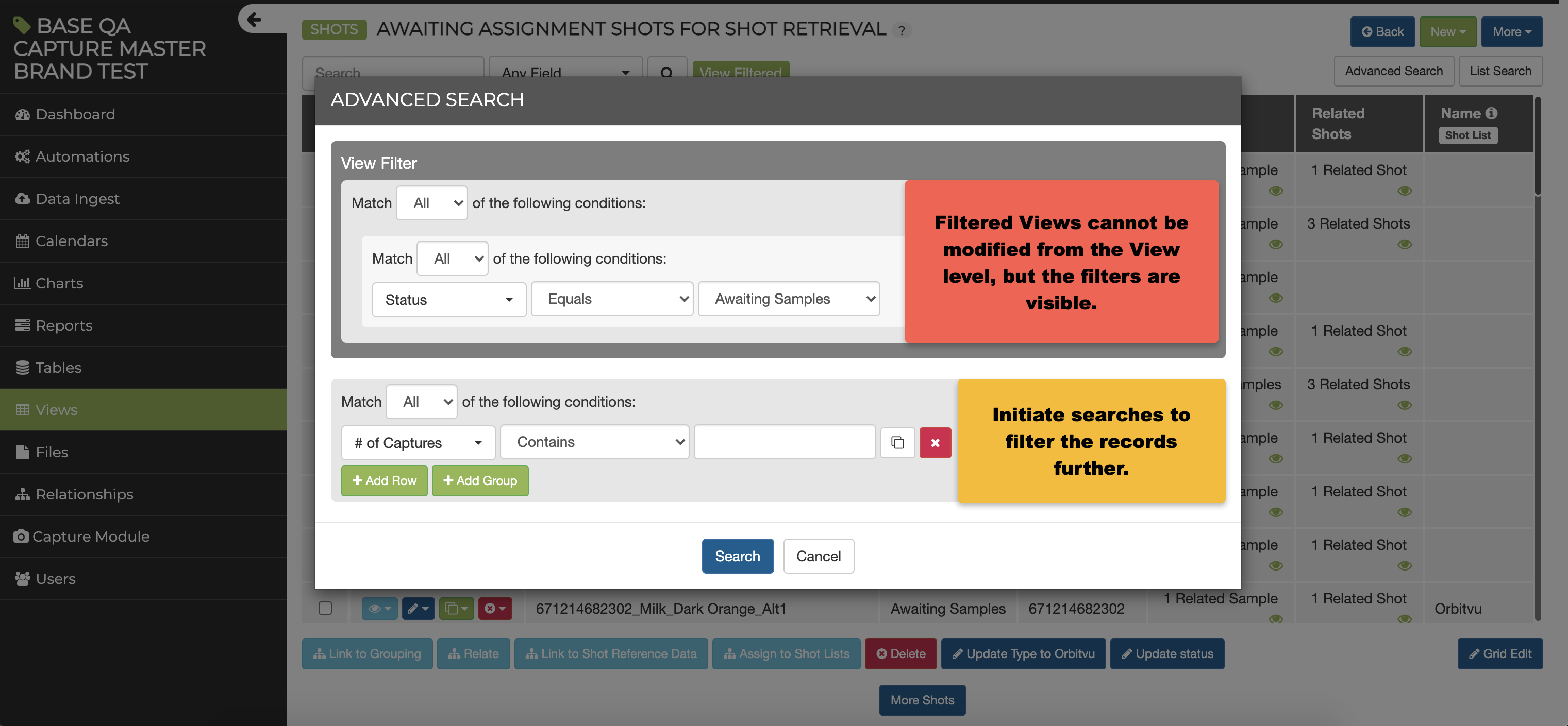 You can see what filters have been applied to the View by choosing the [Advanced Search] box. A pop-up window will open to display the filters in a gray box. You are not able to change or remove these preset filters; however, you can initiate additional searches to drill the data down even further if desired.